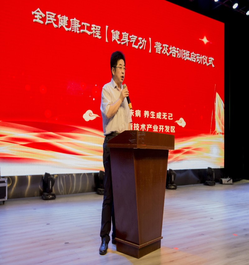 本次活動(dòng)由聊城高新技術(shù)產(chǎn)業(yè)開發(fā)區(qū)社會(huì)發(fā)展局主辦,山東九州生物產(chǎn)業(yè)園協(xié)辦,聊城市健身氣功協(xié)會(huì)、九州教育學(xué)院承辦。聊城市體育局群體科科長(zhǎng)賈會(huì)軍同志,聊城高新區(qū)社會(huì)發(fā)展局局長(zhǎng)姚型太、婚姻登記處主任張明美,體育科科長(zhǎng)王永浩,高新區(qū)610辦公室周管濤,聊城市人民醫(yī)院中醫(yī)科主任、聊城市健身氣功協(xié)會(huì)主席谷萬(wàn)里,聊城首位健身氣功傳播者、國(guó)家級(jí)健身氣功裁判員、聊城市健身氣功協(xié)會(huì)秘書長(zhǎng)謝世光、九州生物產(chǎn)業(yè)園董事長(zhǎng)劉欽松,共同宣布啟動(dòng)全民健康工程[健身氣功]普及活動(dòng)儀式。